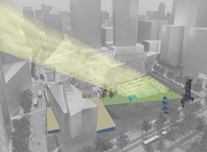 Site-specific art is always the most compelling, and this Memorial proposal resonates with its celestial orientation by installing a series of mirrors on the south-facing exposure of the Freedom Tower. These mirrors constantly track the sun or the moon, reflecting their energy to the original Trade Center footprints and down into the Memorial basin. Every day, at the hour and minutes of the attacks, the mirrors are programmed to gently lift their illumination from the two footprints, proceed respectfully along the streets, towards the river and into the sky. Moving in concert, they form a virtual lighthouse sweeping a beam of hope and memory across landscape.